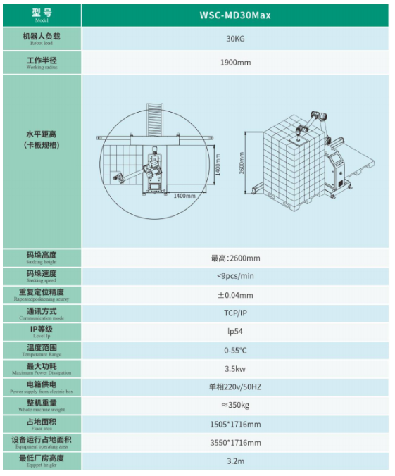 (3)Max power consumption 3.5kW, footprint 1505×1716mm, space-friendly for workshops; minimum workshop height requirement only 3.2m.Palletizing speed < 9pcs/min, repeat positioning accuracy ±0.04mm, ensuring precise operation and reliable continuous running.30kg large load capacity, 1900mm working radius, up to 2600mm maximum palletizing height, covering mainstream pallets and high-position palletizing scenarios.