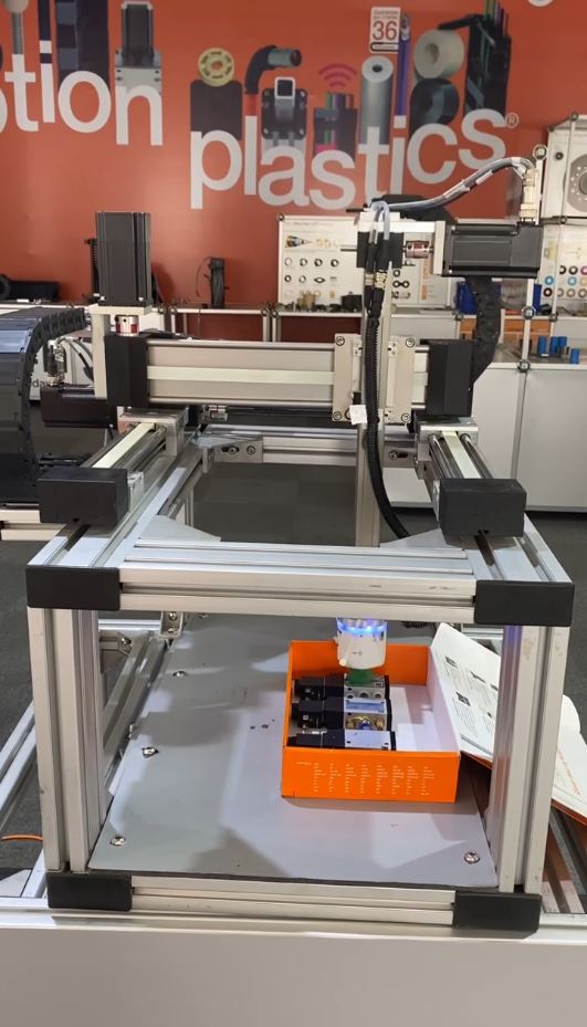 在此模擬客戶處理氣缸,電磁閥和配件的應用中,仍然手動執行的"拾取&位置"任務是自動化的。 最後,最多可以實現 12 個選擇/分鐘。 在這種尺寸下,龍門架的重複精度為 0.8 mm,可容納高達 2.5 公斤的有效負載。 所使用的末端執行器是 Schmalz 的協機器人泵,它通過產生高達 -600 bar 的真空來拾取工件。 Cobot 泵最大有效負載為 3 kg,是自動化小零件處理的理想選擇。