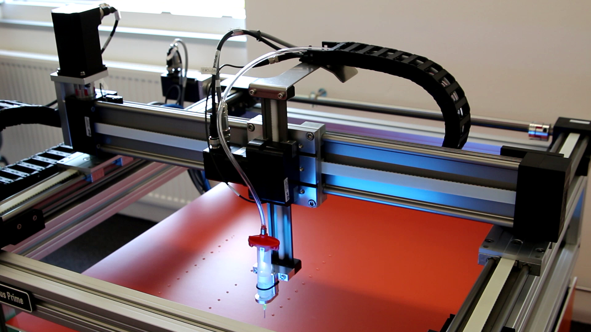 在此客戶測試中,igus 房間龍門架執行點膠任務。小滴必須以一定的圖案噴灑在表面上。在龍門機構上的注射器加藥系統的幫助下,可以實現客戶的要求。